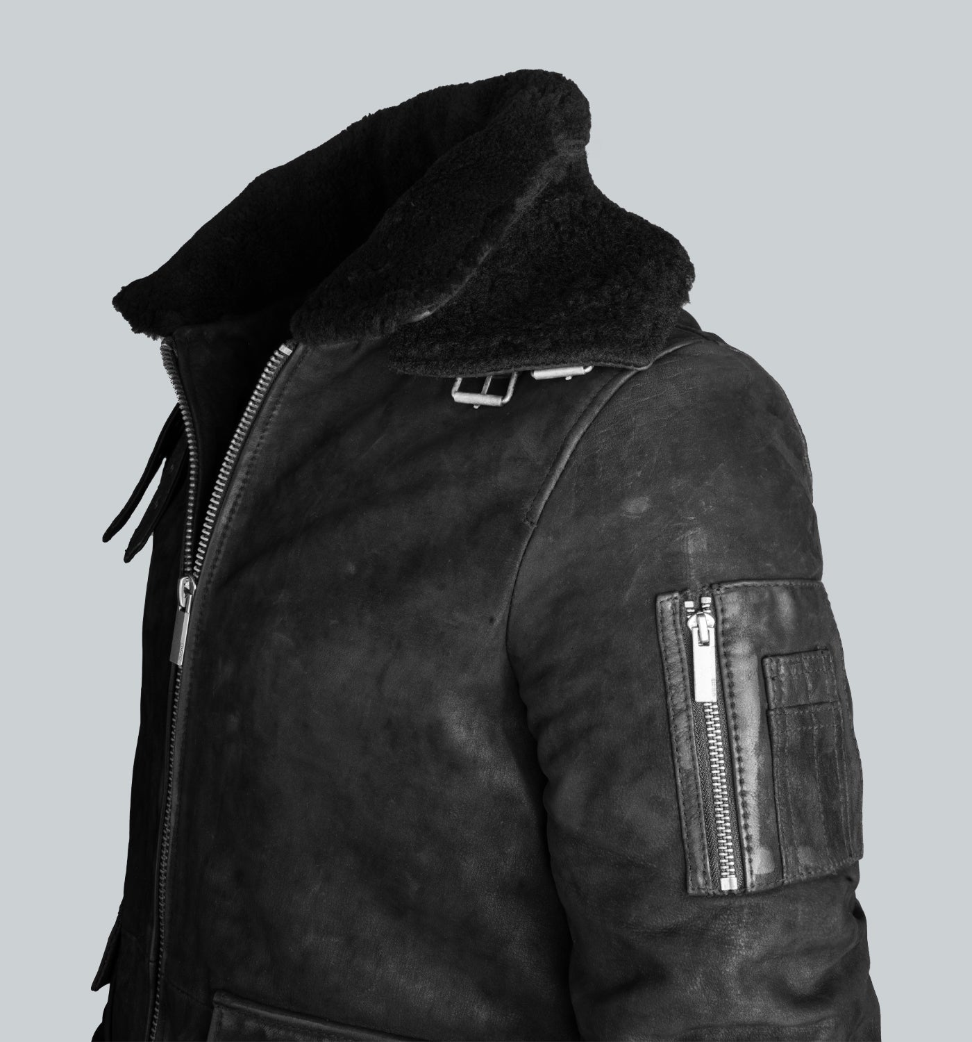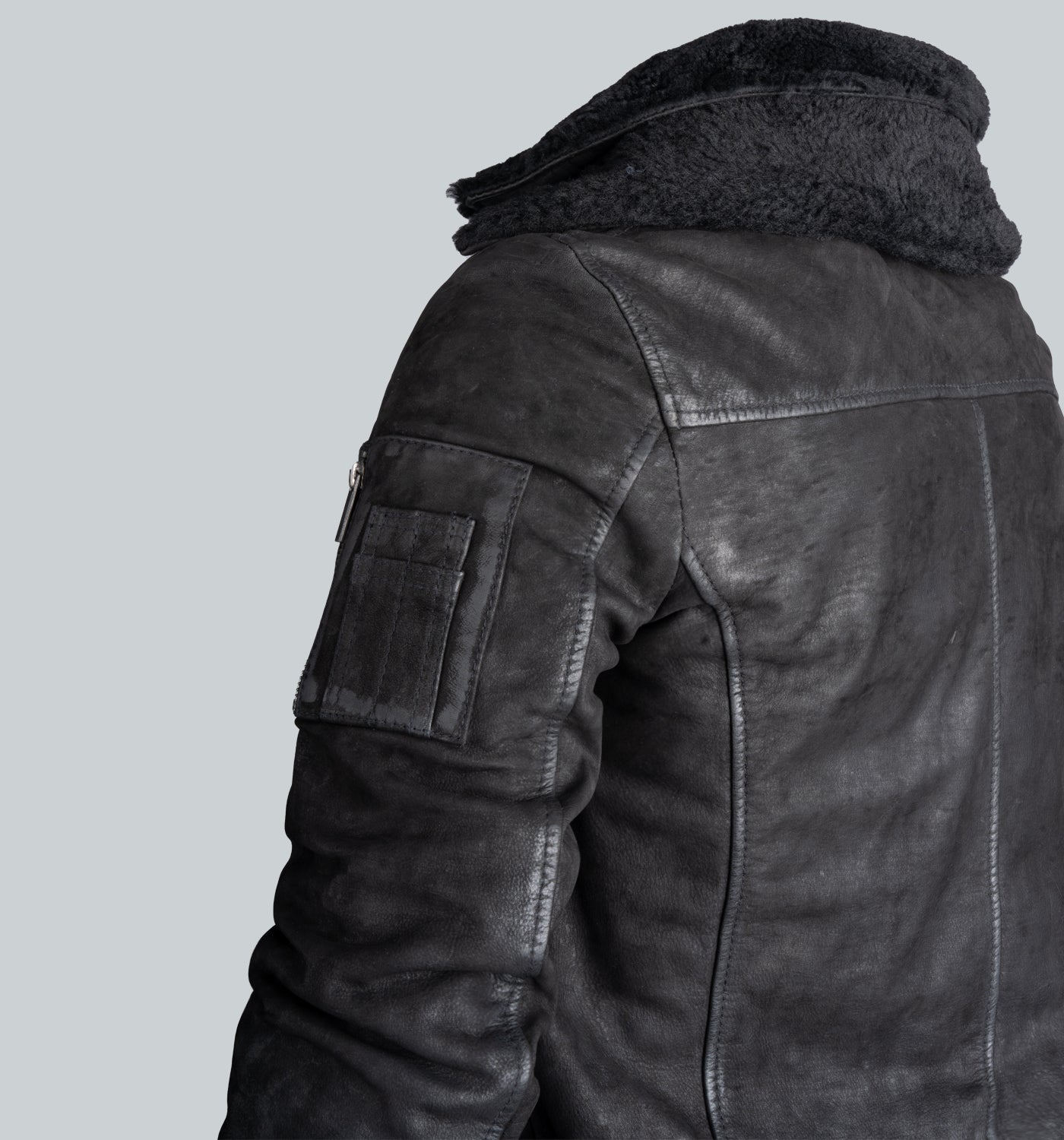 Die Talvi ist aus 100 % echtem Rindsleder im Nubukleder-Buffed-Finish gefertigt und mit einem doppelten Premium-Schafslammfell-Kragen ausgestattet. Im Bomberjacken-Stil mit Echtleder-Stretch-Elementen an Arm- und Jackenabschluss bietet sie sowohl Komfort als auch einen markanten Look. Die schwarze Elephant Nubukleder Vintage Waschung sorgt für pflegeleichte Handhabung bei jedem Wetter.